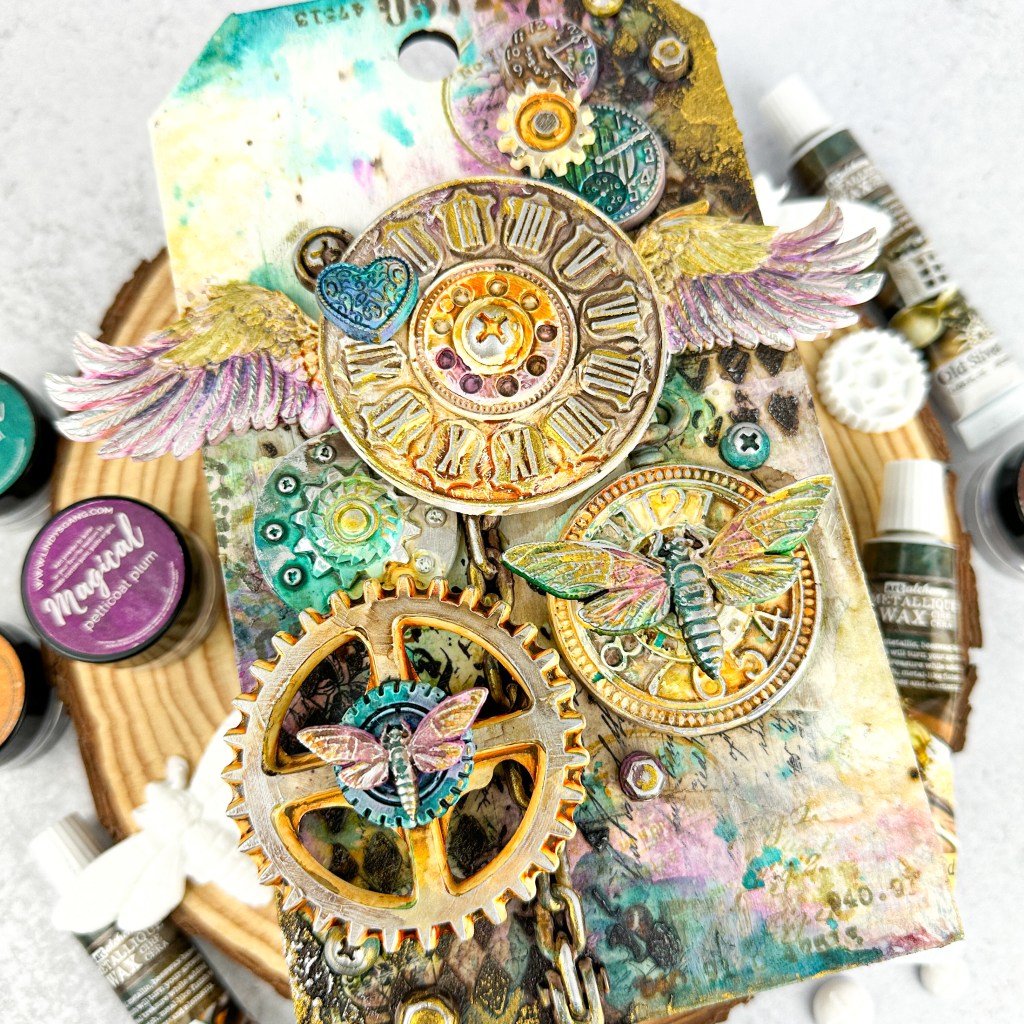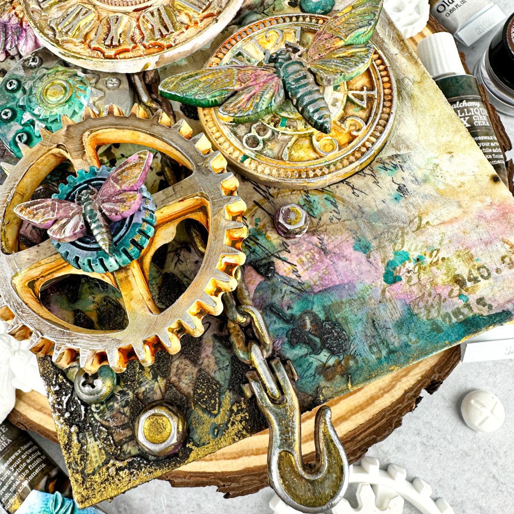 7. The last step is to really bring out those details with metallic wax. I used Vintage Gold, Emerald, and Old Silver. Seriously, these waxes are SO beautiful!! I added a little wax to my palm and used my fingers to dab colors here and there. It is hard to capture in photos, but in person you can see the beautiful, pearlescent colors. The wax really makes the elements look like real metal which adds to that fun steampunk feel.