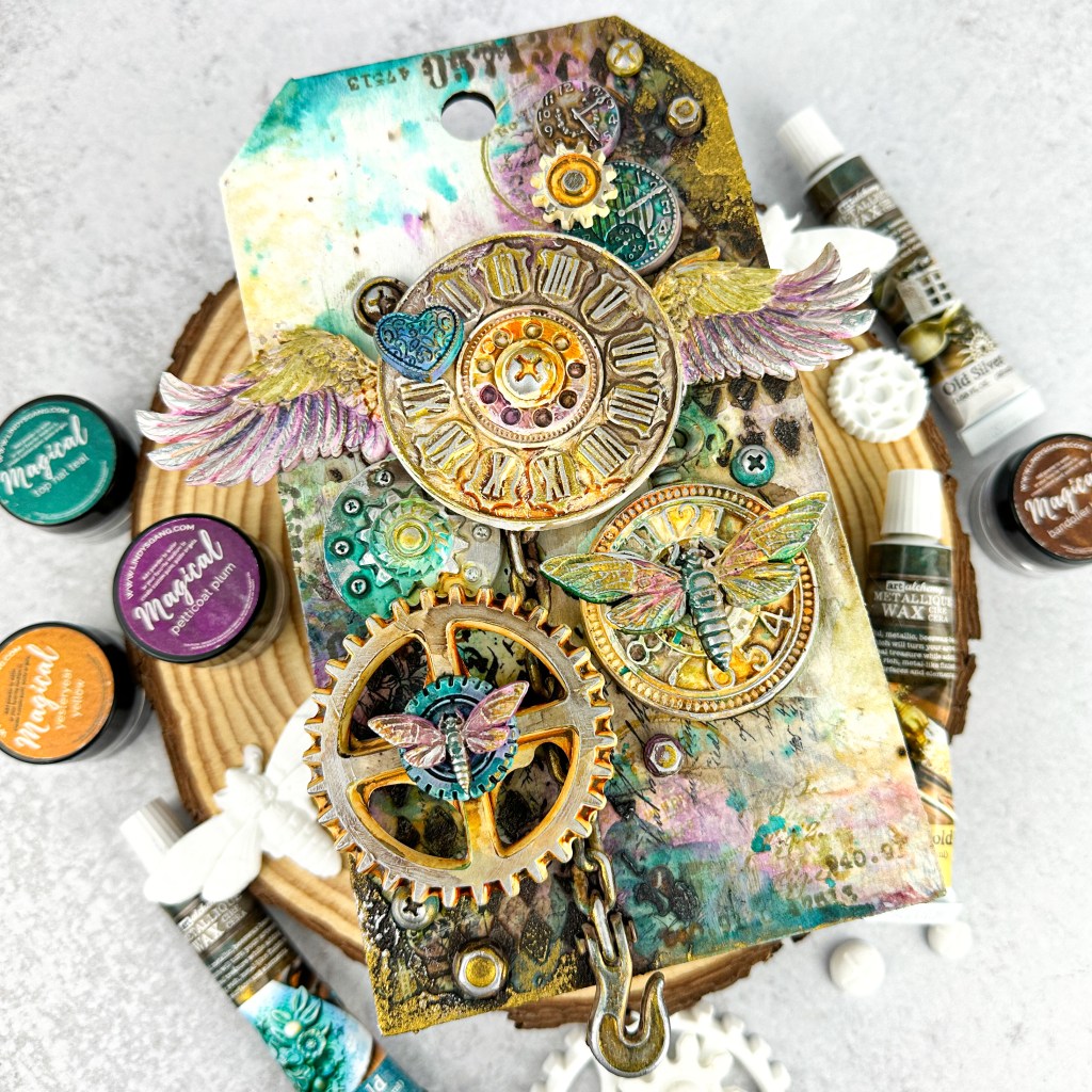 Once you are happy with the composition, take a picture so you can refer to it later. Add white gesso to every piece you want to add to the tag. Some people glue the pieces in place on the tag and then gesso, but I gesso’d each piece individually. The gesso makes a great base for additional mediums and seals the pieces. Next, paint all of the pieces with the same colors of magical powders. Again I painted each mould individually. Be mindful of how you’re using the colors so there is variation and interest.