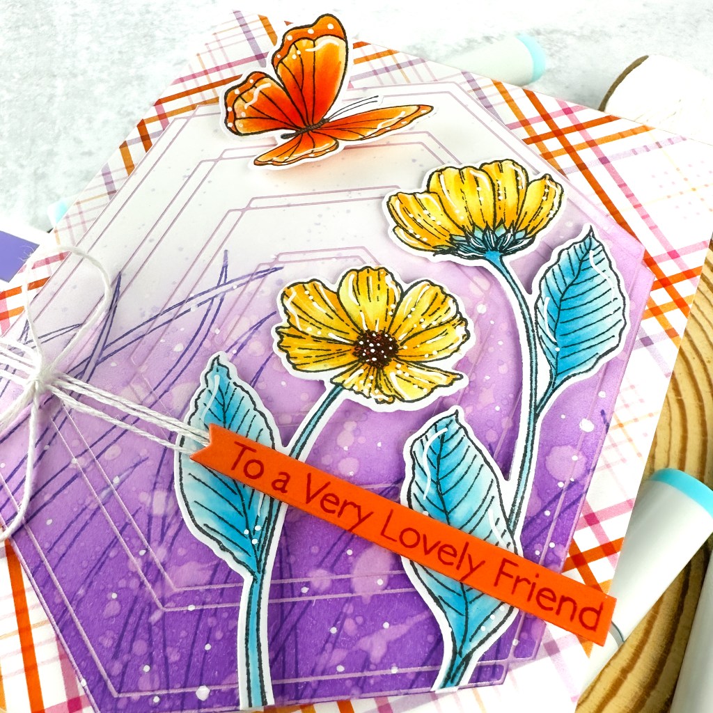 - Stamp and copic color the flowers and butterfly from Butterflies and Blooms. Die cut with the coordinating die-namics. Pop up the flowers and butterfly with foam tape.