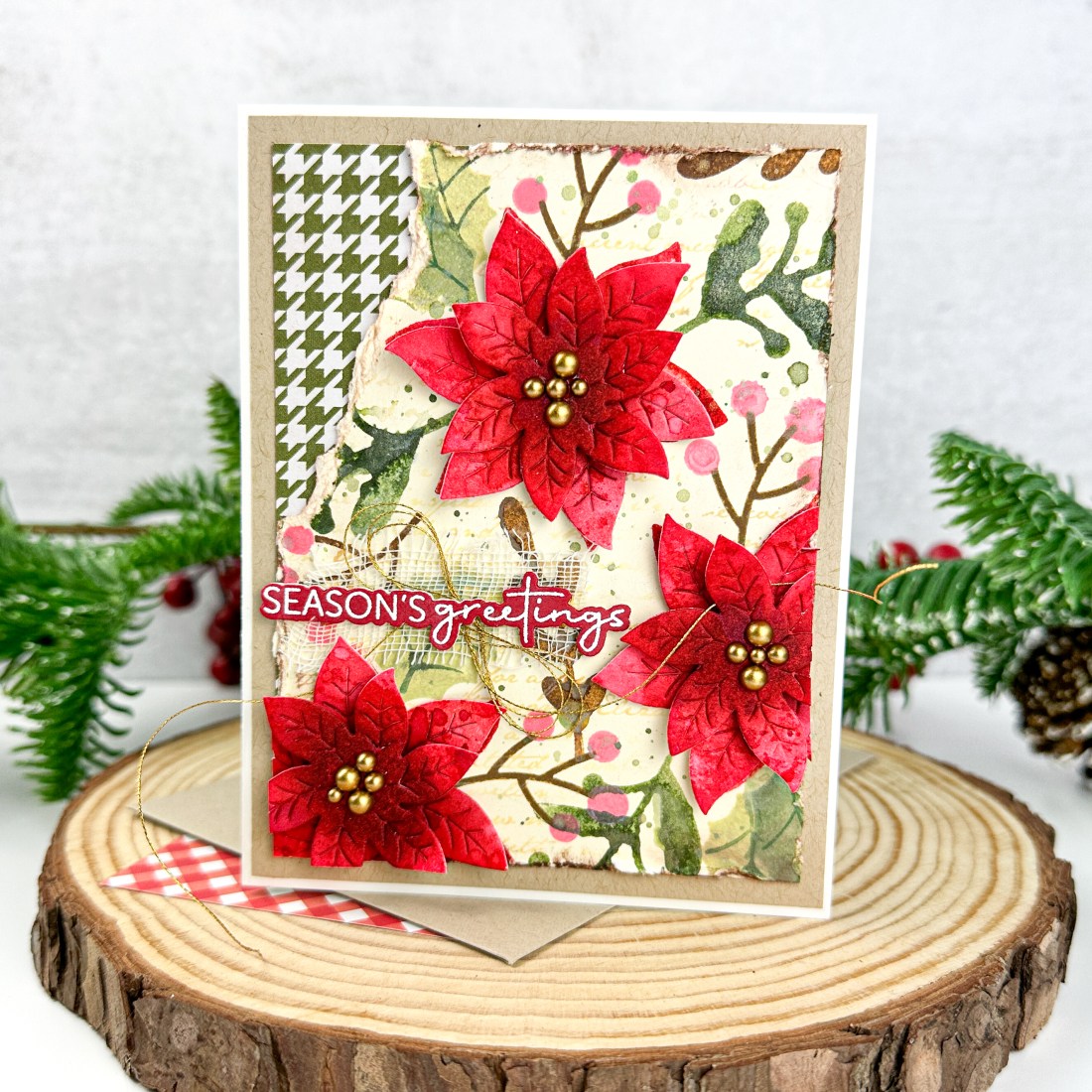 I’m back with more inspiration using items from the newest MFT Stamps card kit, Christmas Poinsettias. If you love this kit, run to the shop and pick it up! I have a feeling it won’t last for a long time. Yesterday, I played with all die cuts, but today I am pairing the dies with the Pressed Poinsettias stamp set. I recently saw a video from Dawn at Wplus9 and was inspired to create this card by stamping with my distress mica sprays.