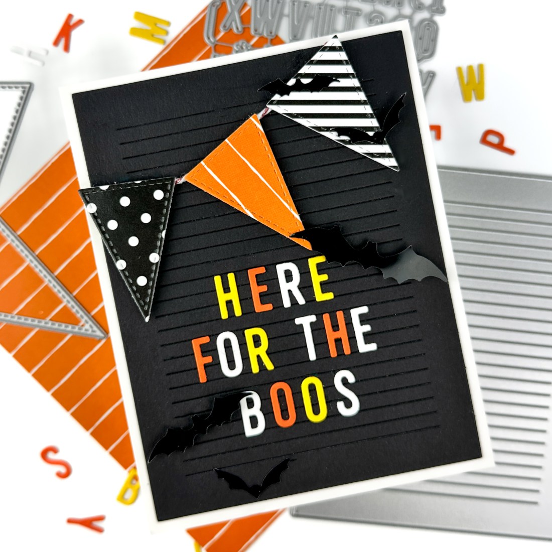 I made a clean and simple, no stamping Halloween card featuring the brand new Letterboard Die-namics. I was inspired by all of the letter board designs that you find in home decor on Pinterest.