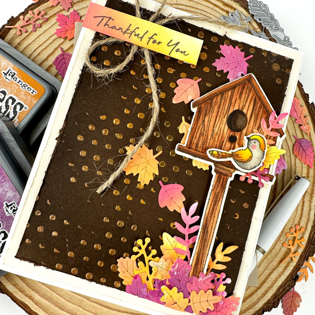 7. On cream cardstock, stamp a sentiment from Grateful Greetings and add some ink blending to match the leaves. Add baker’s twine behind the sentiment.