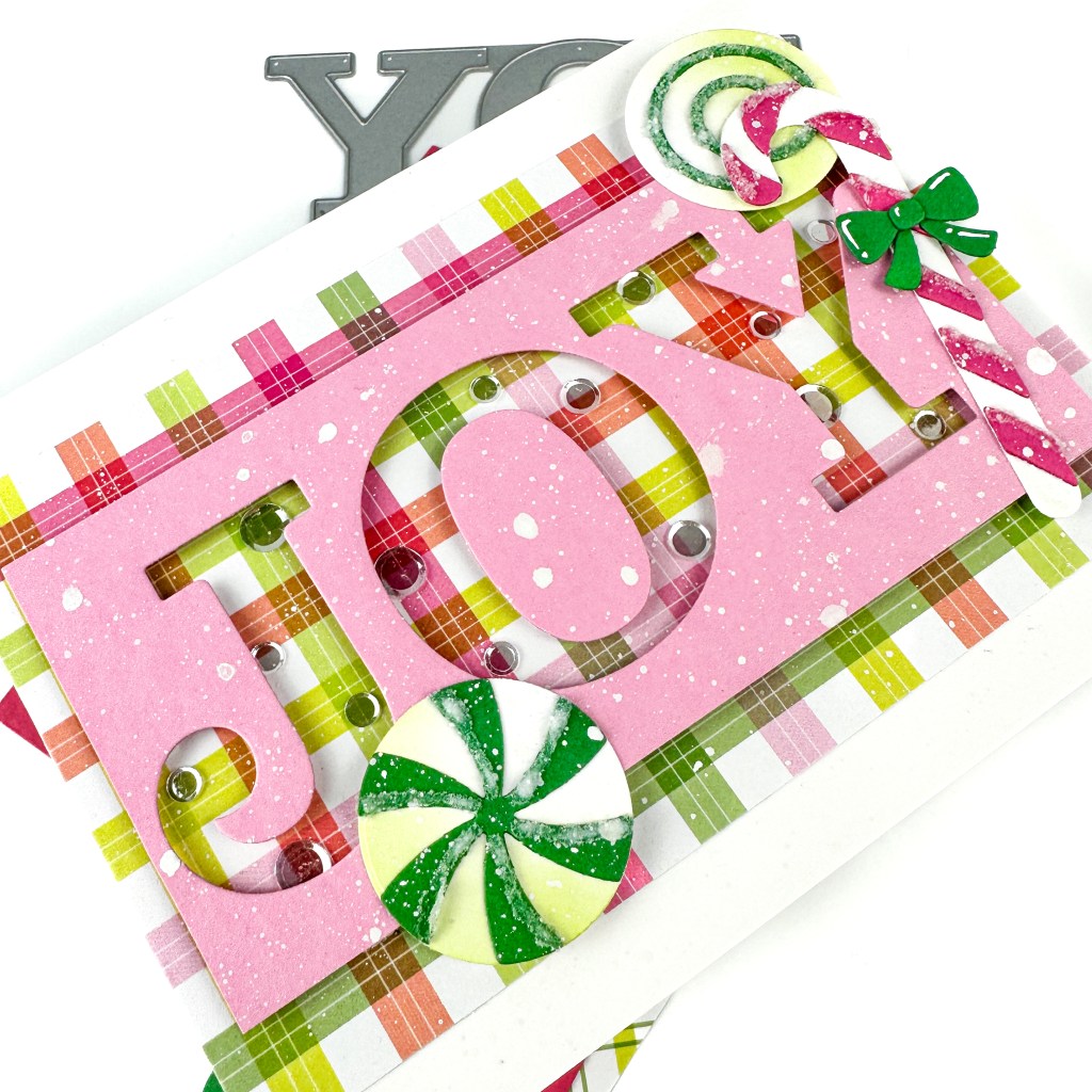 1. Die cut the Joy Die-namics from Cotton Candy cardstock. Trim it down to fit a card front.