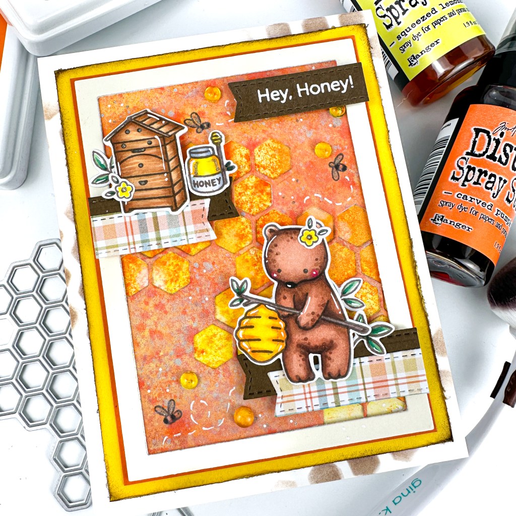 - On an A2 card base, use the Peek-a-Boo Honeycomb Die-namics as a stencil and ink around the perimeter of the card base using Vintage Timber ink.
