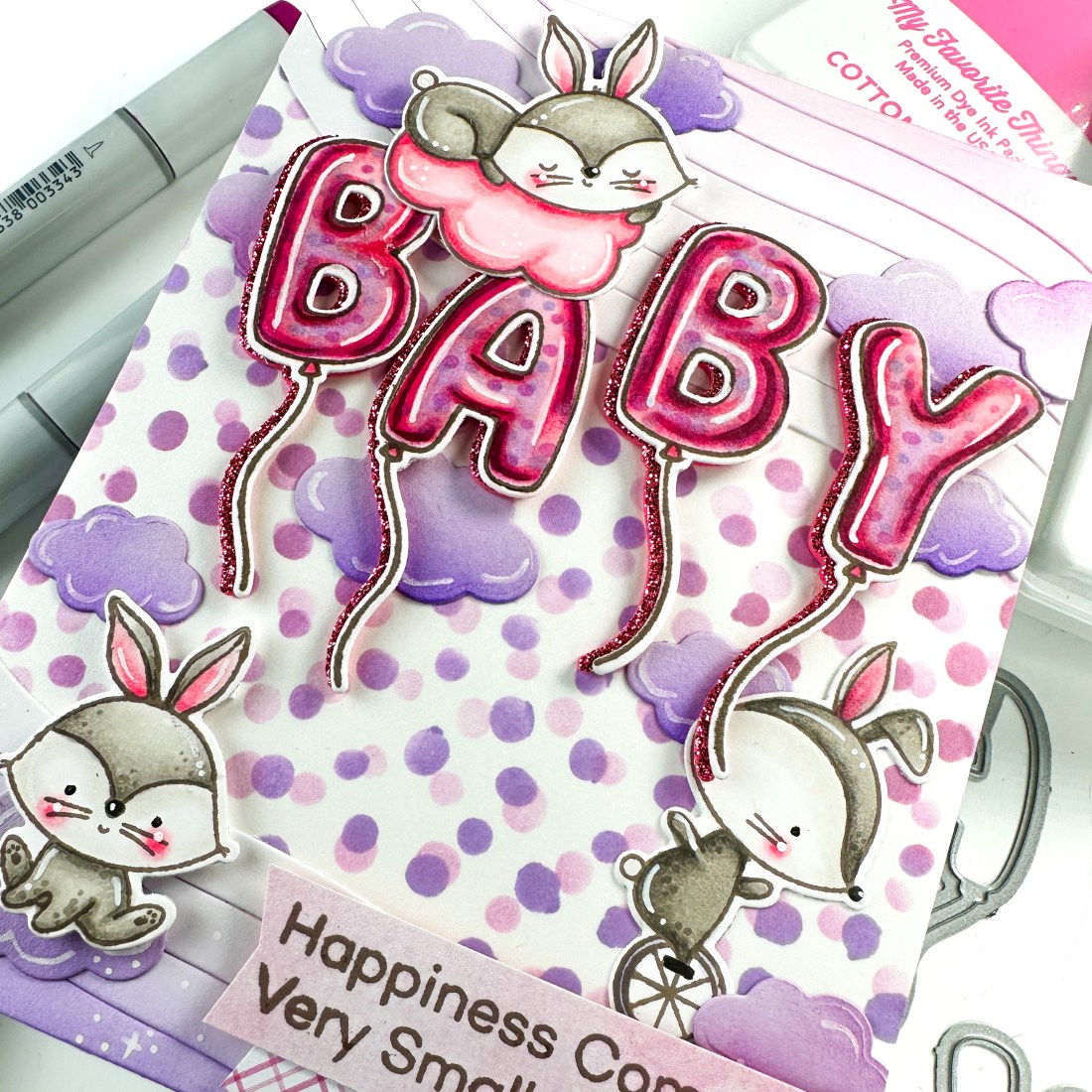 Hello friends! Only two more days until the brand new February MFT Stamps release. Have any favorites yet? Today, I am featuring the Happiness Comes in Very Small Packages Stamp & Die Duo. A good friend is having a sweet baby girl in a couple months so this card will go to them. Aren’t these bunnies adorable?