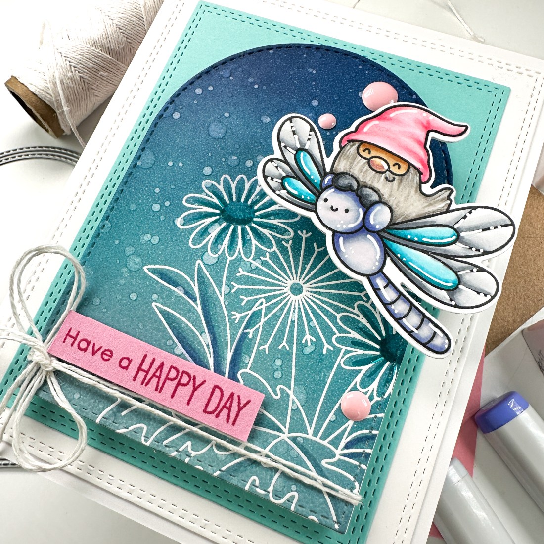 - Stamp and copic color a gnome. Die cut with the coordinating die-namics. Adhere the gnome with a mini action wobbler to make the card interactive.