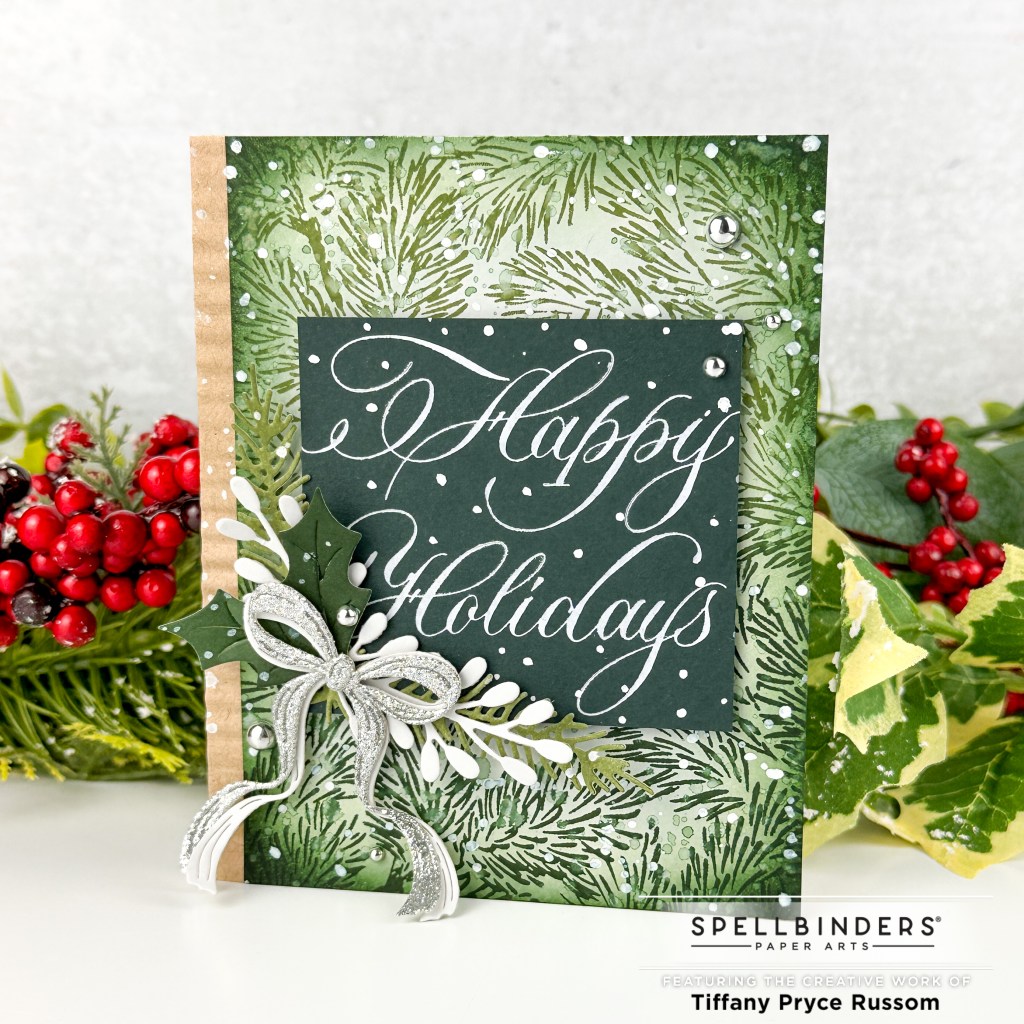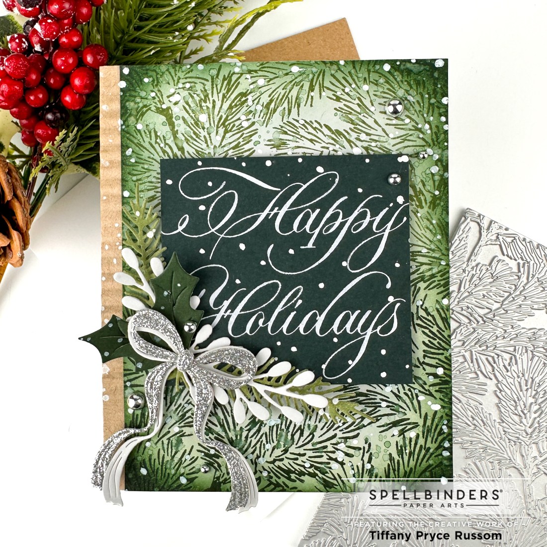 Hey there! Are you tired of holiday cards after Christmas in July? I hope not because I am sharing a new one, lol. I could do holiday cards all year as I love them so much. Christmas is my favorite holiday. Spellbinders kindly sent me a few recently released products that I haven’t had a chance to play with yet. Today’s card features the Copperplate Happy Holidays Betterpress plate and the Night & Day Pines Betterpress plates. I added a bow and foliage from Christmas Cocktails and Christmas Bird Poinsettia, respectively. I think this turned into a classic, but fun design.