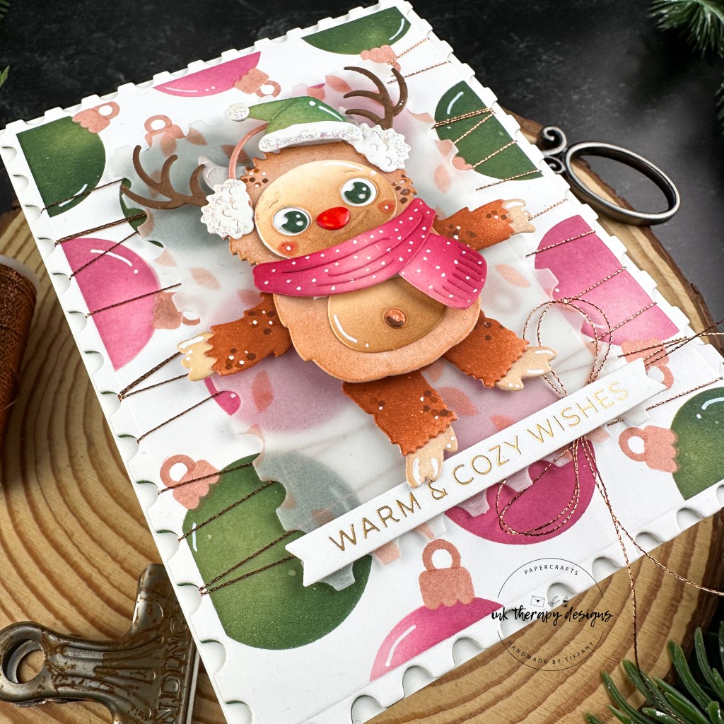 - Using the Baubles & Festive stencils, stencil the baubles in green and pink. I used two shades of each color to add dimension to the ornaments. For the topper, I used the Lisa Horton copper metallic ink. Since these stencils are sold out, search your stash for another festive stencil set for an all over background.