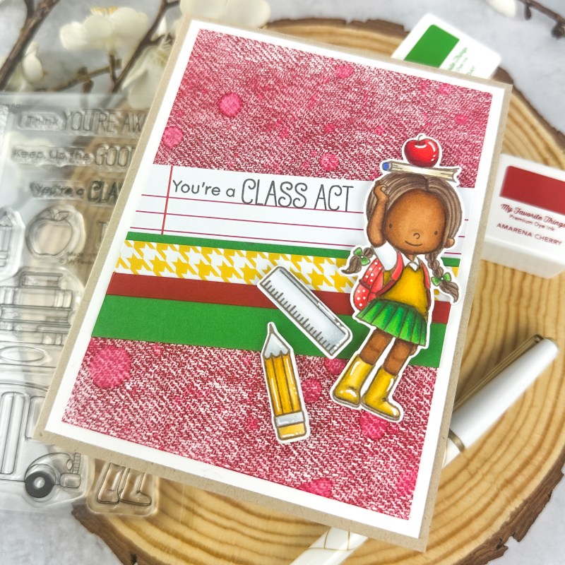 You’re a class act! It’s back to school time for many, so this stamp set, BB Class Act, from the MFT vault is perfect! Today’s card came together really easily and used up paper scraps in my stash.