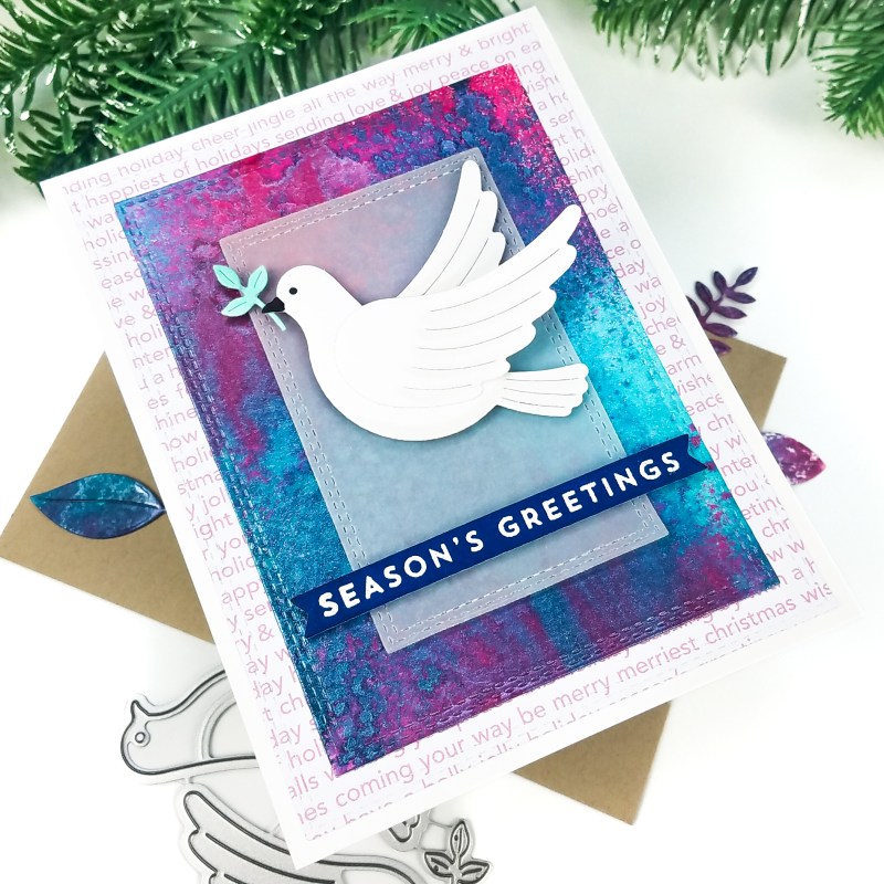 It’s release day over at the MFT Shop! If you’re shopping, I hope you love your new goodies! I’m sharing another card made using the Peaceful Dove Die-namics that I paired with an inky background.