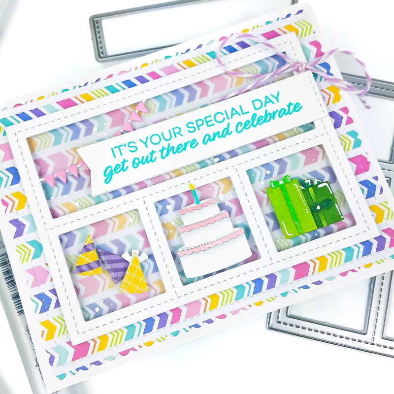 Hey friends! Today is release day for the Let’s Party card kit! And I have another card sample to share with you. Be sure to visit the MFT blog for more details on what the kit includes and other card samples. Die cut patterned paper from Hip Hip Yay paper pad and white cardstock using…