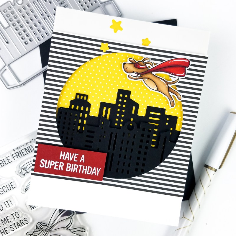 Only 1 more day until the new release is live! Today, I’m sharing a clean and simple card with you featuring the To the Rescue stamp set and coordinating die-namics. I also used the new Outside the Box Cityscape Die-namics on an A2 card.
